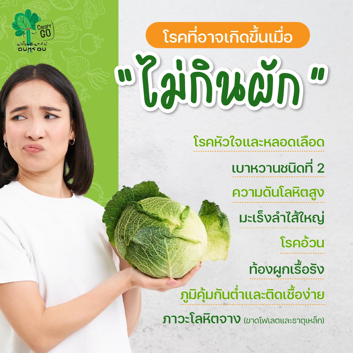 จัดผักให้น่ากิน ผสมในเมนูที่ชอบ หรือใช้ตัวช่วยอย่าง CRISPY GO! เพื่อให้ได้รับไฟเบอร์จากผักจริง